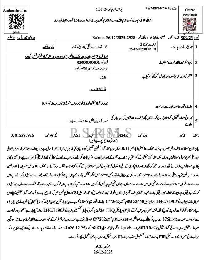 راولپنڈی: کہوٹہ کے علاقے میں 11 سالہ بچی سے مبینہ زیادتی کے واقعے کا سی پی او راولپنڈی سید خالد ہمدانی نے نوٹس لیتے ہوئے کہوٹہ پولیس کو فوری اور مؤثر کارروائی کی ہدایت کی۔ پولیس نے جدید ٹیکنالوجی کی مدد سے ایک خاتون سمیت تین مشتبہ افراد کو گرفتار کر لیا ہے۔